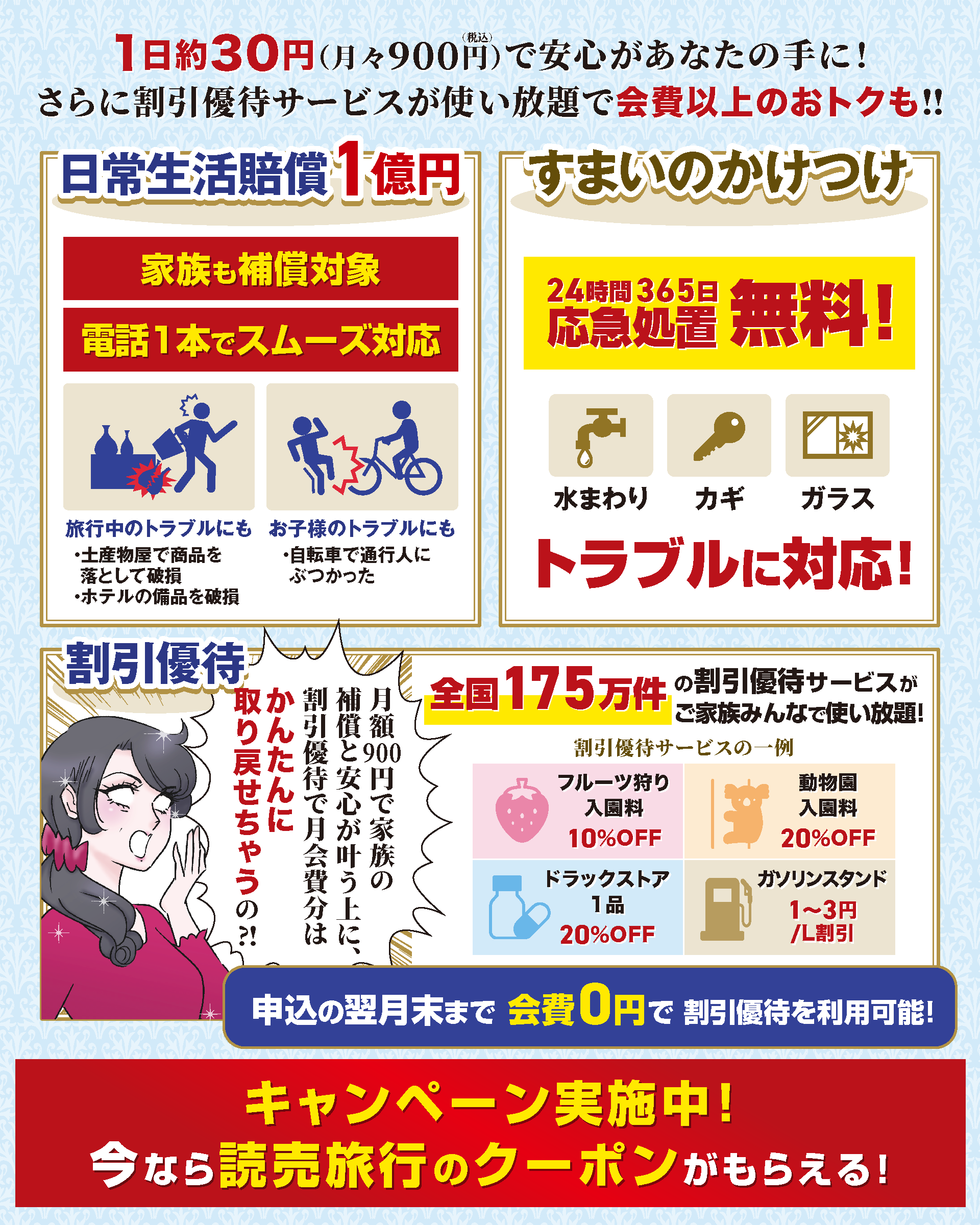 ※対象範囲は本人、本人の配偶者、本人またはその配偶者の親族、別居の未婚の子です。(加入者本人の怪我、財産上の損害は対象外です)